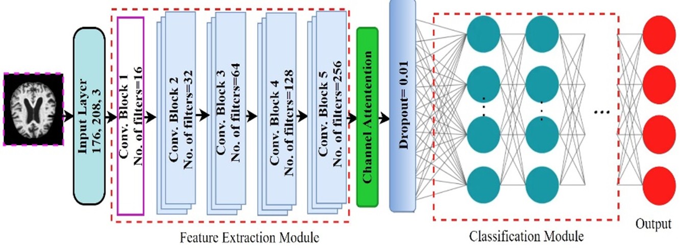 This research proposes a Deep Learning-based system for detecting Alzheimer’s Disease (AD) using MRI images. Addressing the low detection rates often found with small datasets, the method employs a stacked CNN to generate hierarchical feature representations and a channel attention module to select effective features. This approach aims to reduce parameters and computational complexity while achieving high detection accuracy.