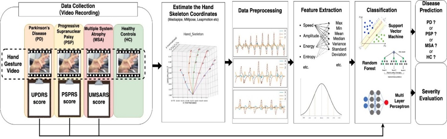 パーキンソン病(PD)と非定型パーキンソンニズムの識別という課題に着目し、本研究では多クラス分類モデルに加え、浮動小数点ベースのスコア評価を行う回帰モデルを提案します。既存の整数ベースの評価よりも高い予測精度を目指すとともに、通院が困難な患者のための客観的な症状観察ツールとして機能させ、治療中の微細な変化の記録を可能にすることを目指します。
